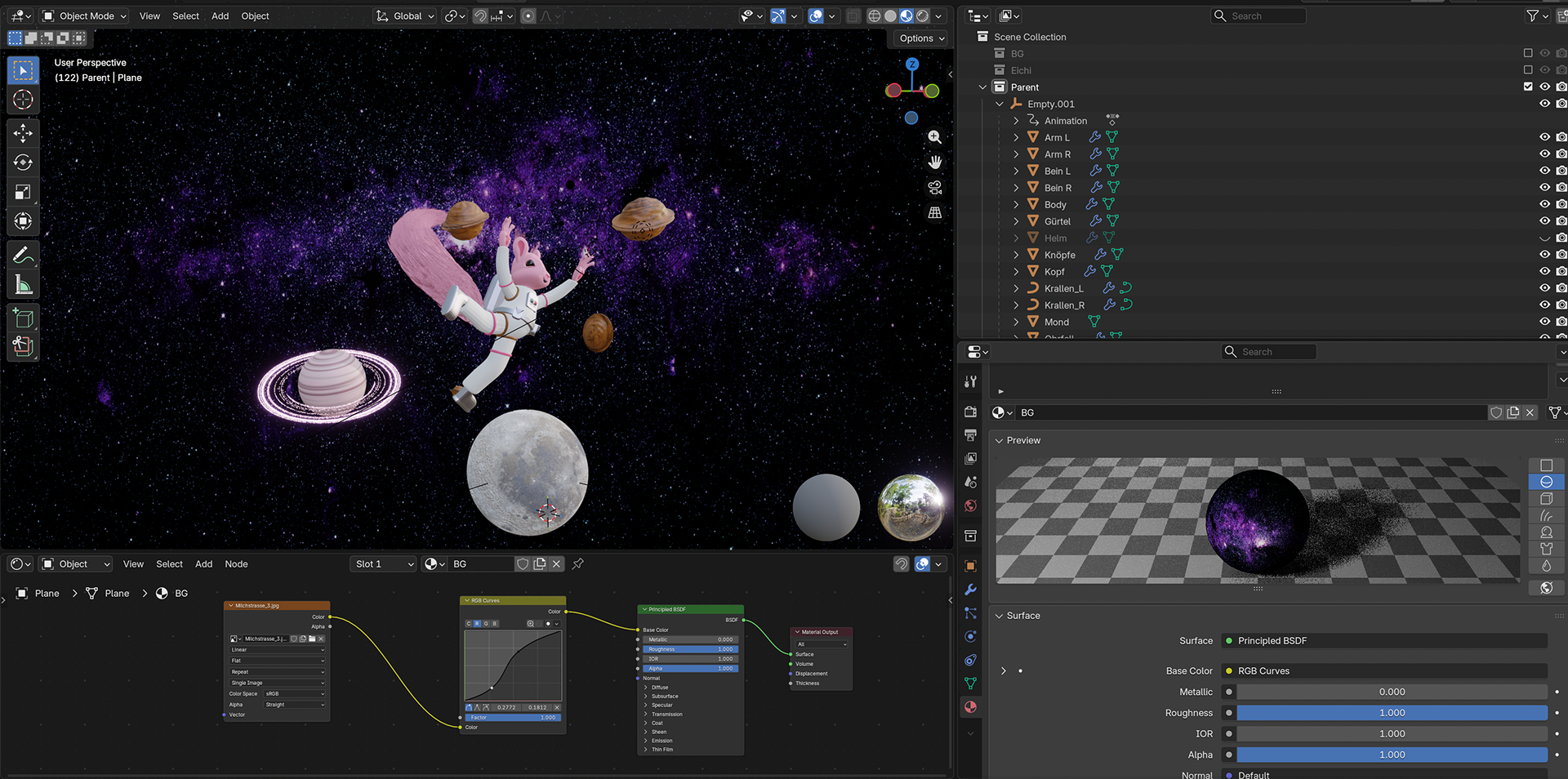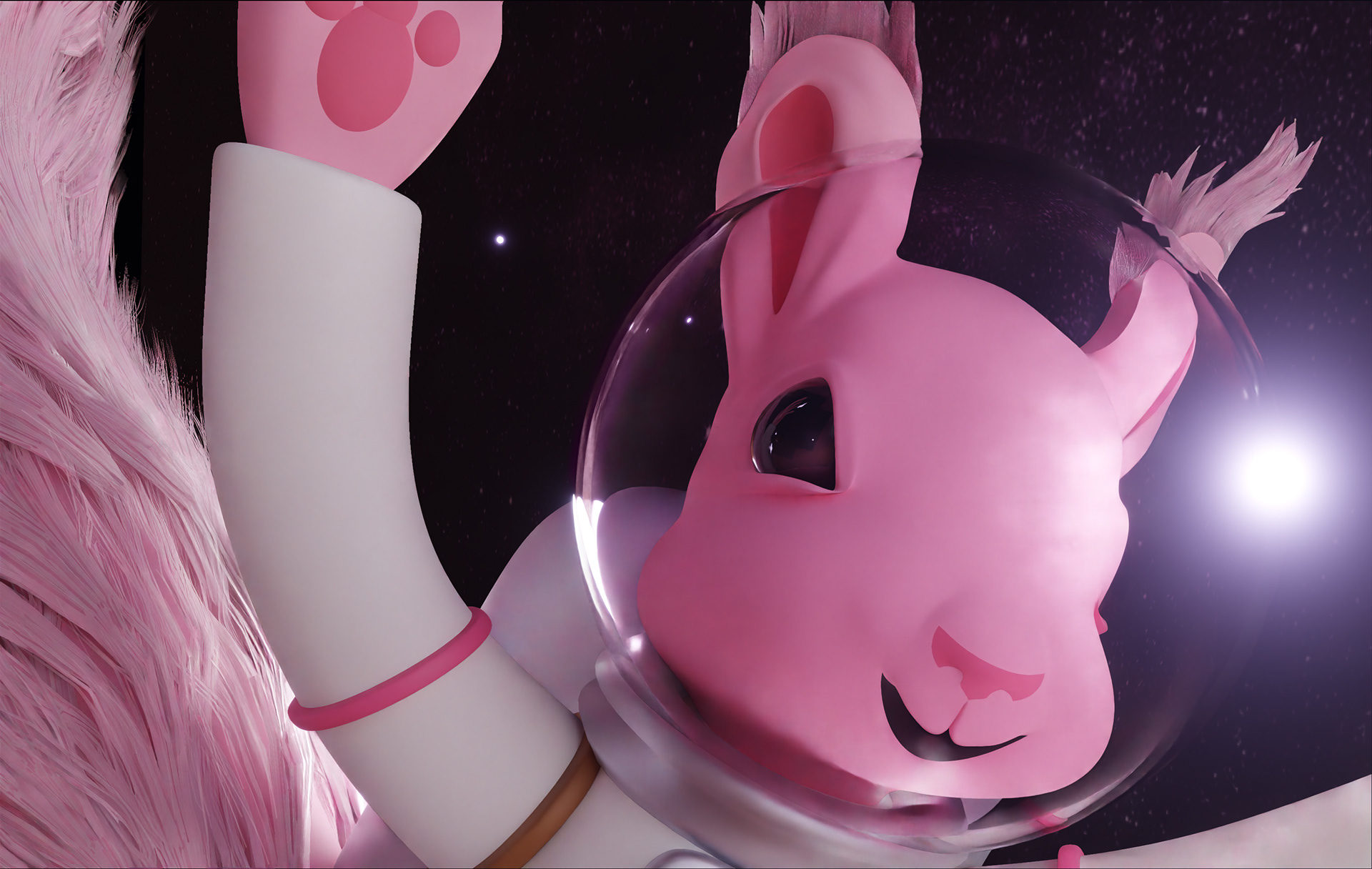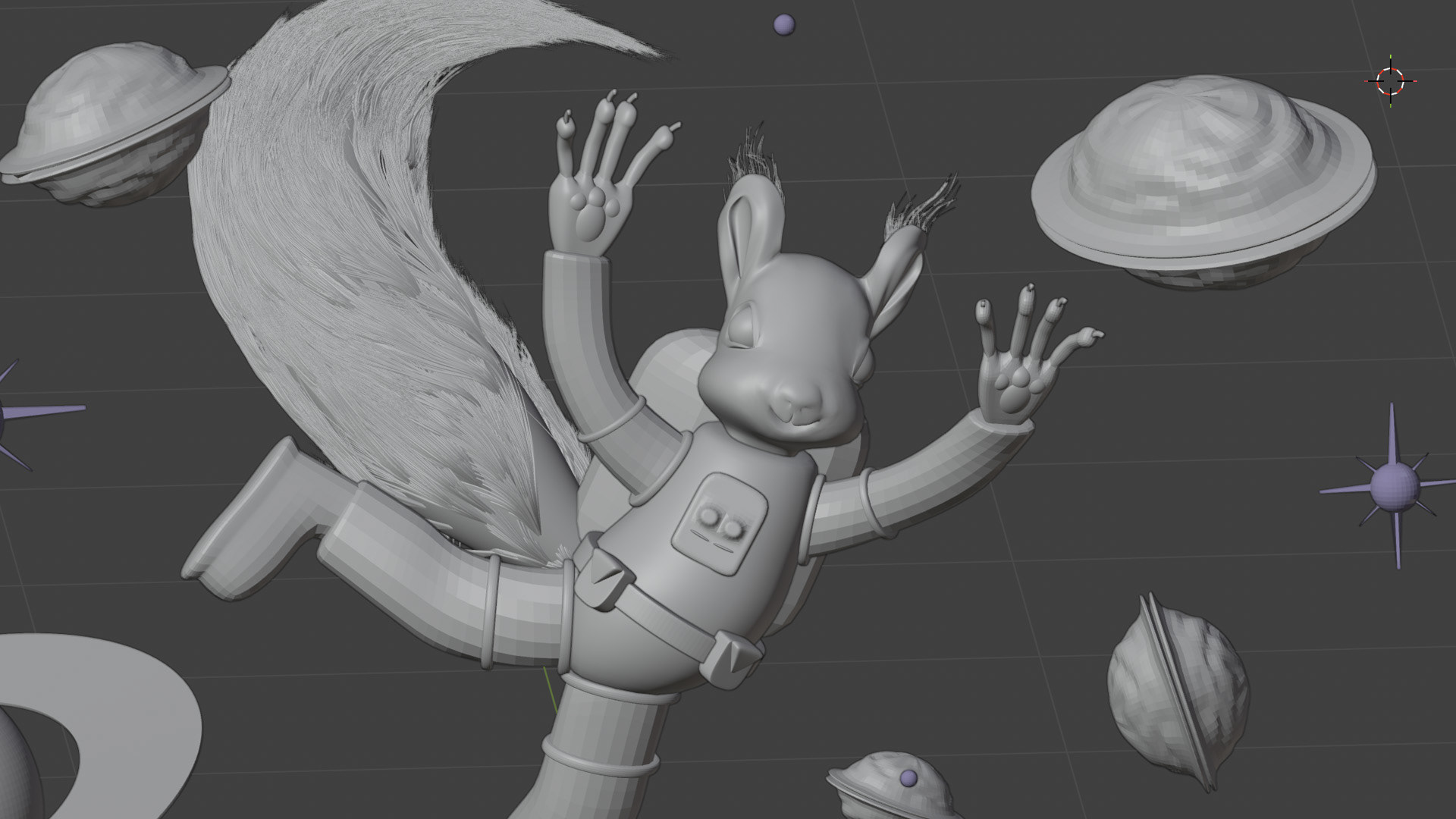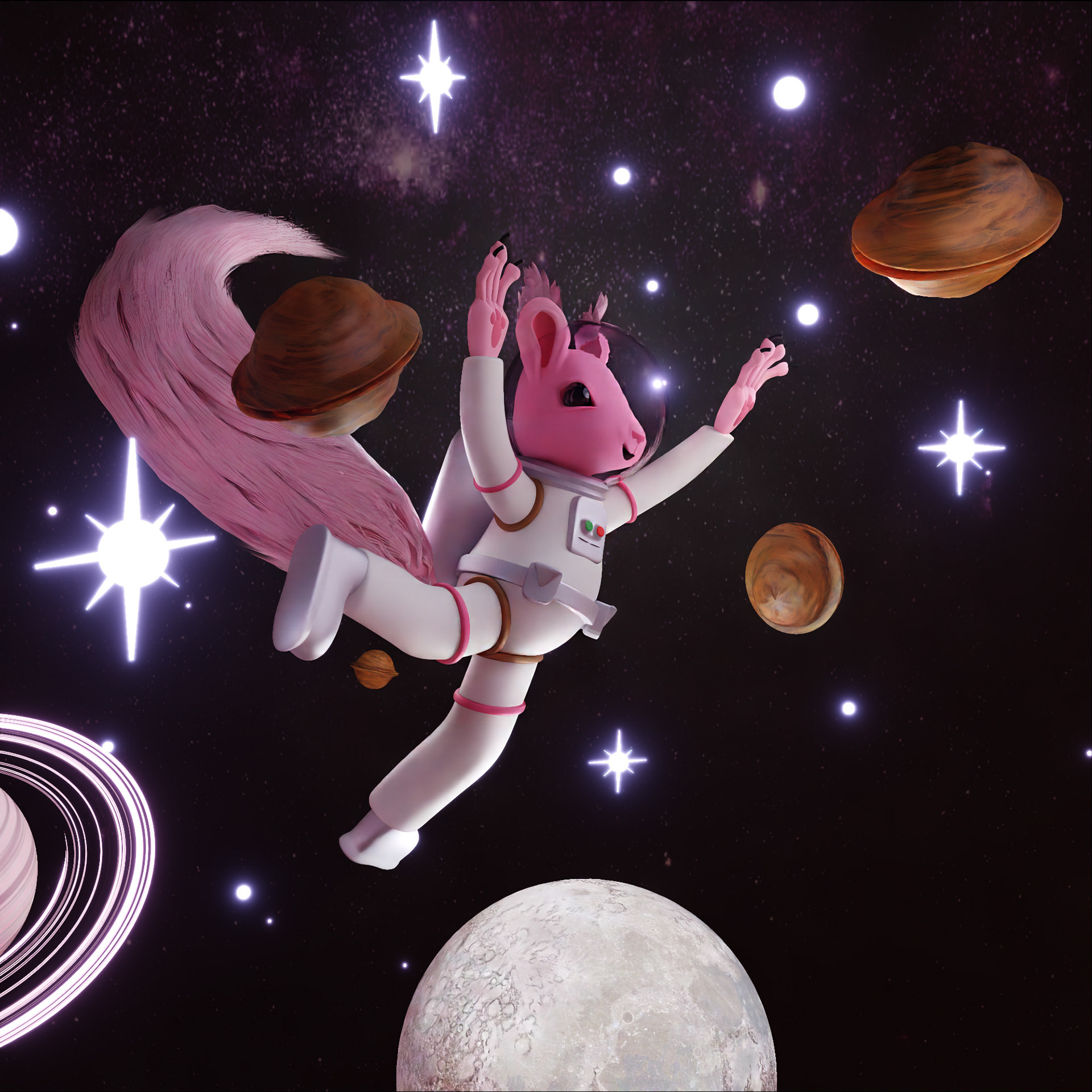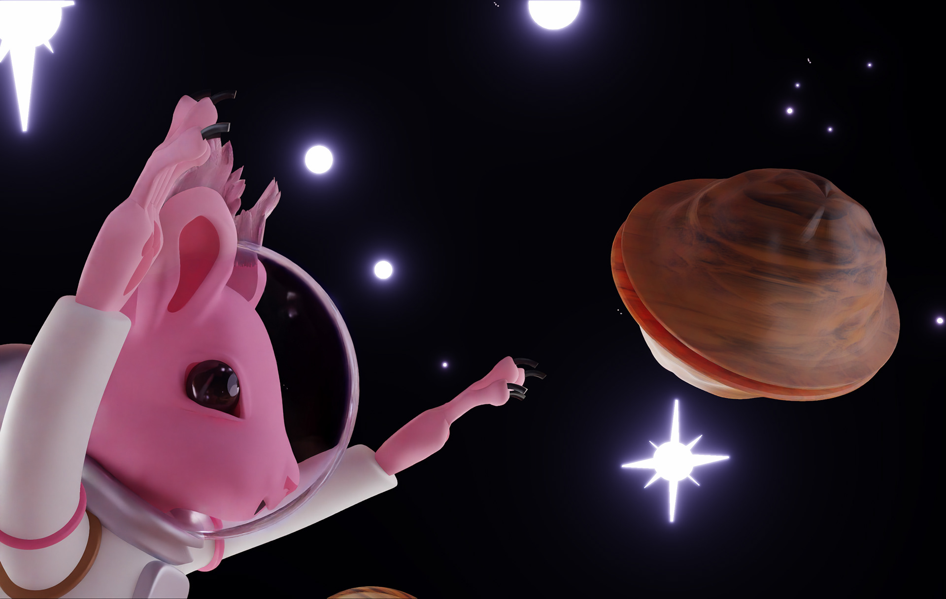 In this project, I created an original 3D character and placed it in a galactic environment. The goal was to combine a realistic 3D look with a surreal and humorous concept. The result is a pink squirrel floating in space, reaching for walnuts, surrounded by stars, planets, and a slightly smaller moon.