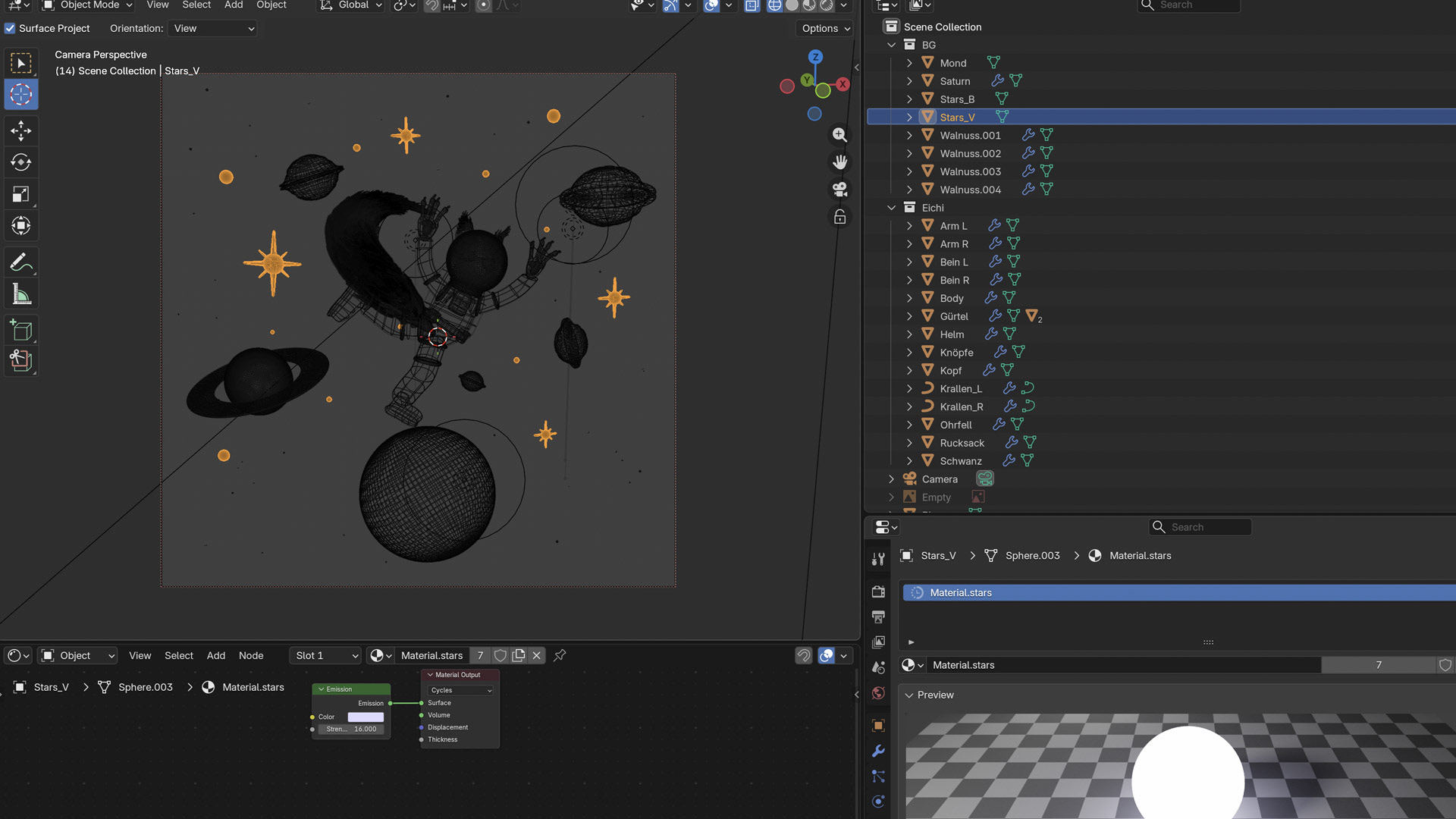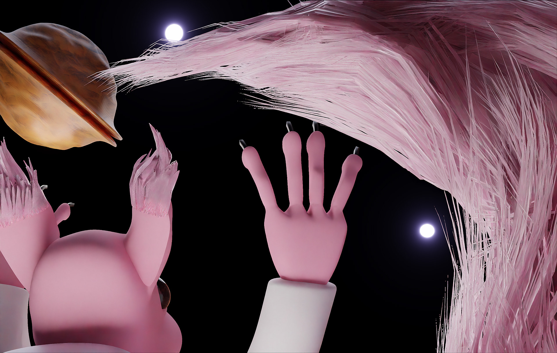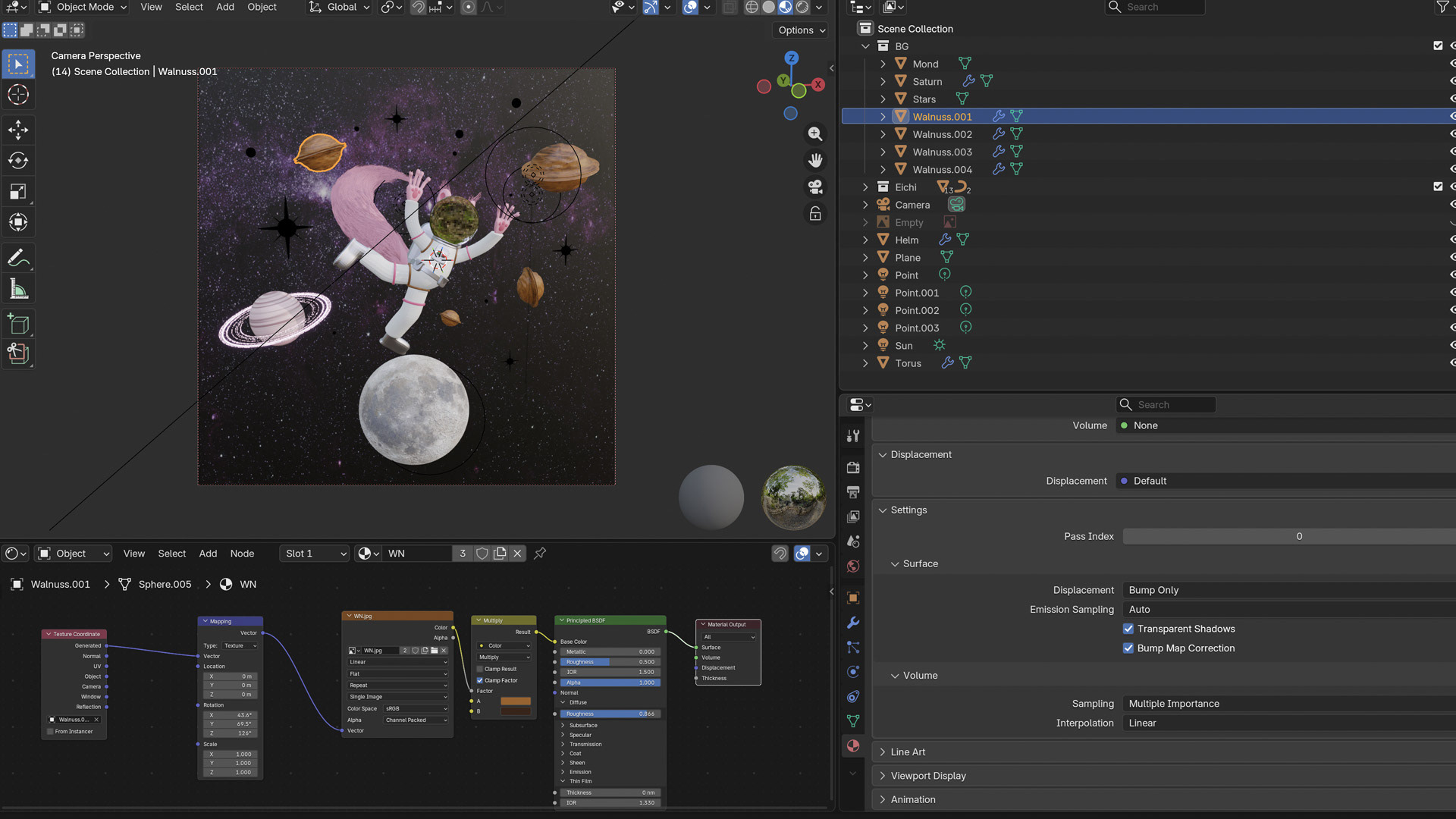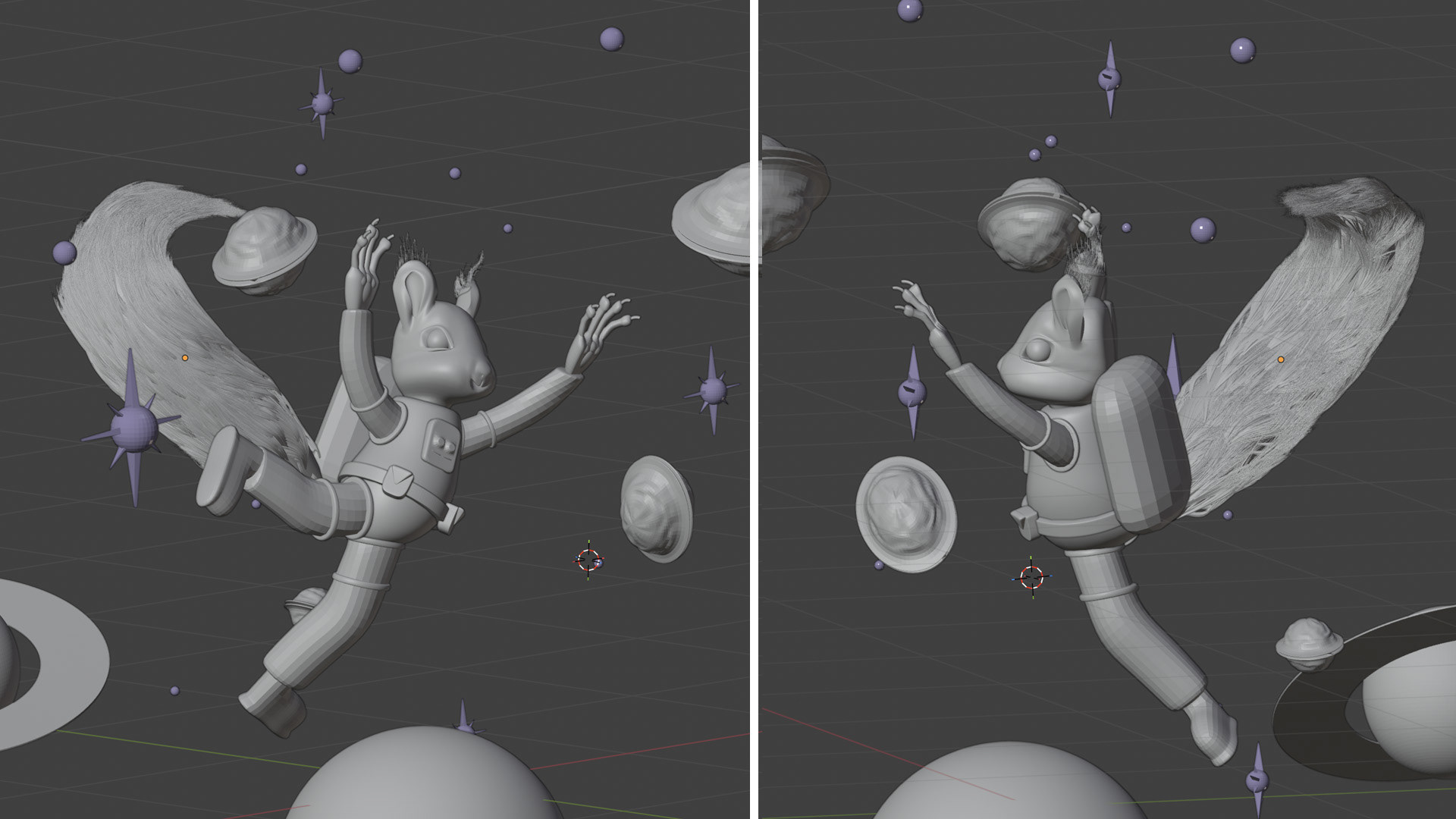 A whimsical 3D character floats through a surreal galaxy, trying to catch walnuts. This scene blends realistic 3D techniques with playful creativity.